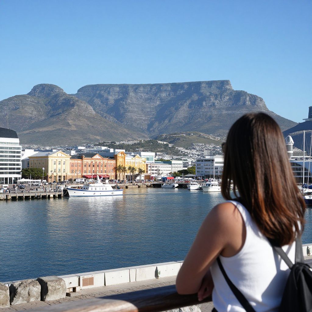 Woman enjoying a scenic view at Cape Town's Victoria and Alfred Waterfront, with Table Mountain looming majestically in the background and a bustling harbor filled with boats and historic buildings stretching along the waterfront.