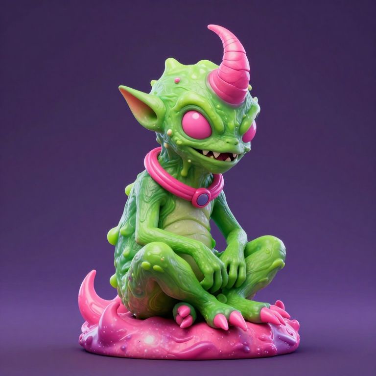 The image features a vibrant, fantastical creature with a distinctive and eerie appearance. The creature has a green, slimy body with a textured, almost squishy look, and it is adorned with a pink, spiral horn on its head and a matching pink collar around its neck. Its eyes are large and pink, giving it a somewhat comical yet unsettling expression. The creature's mouth is open, revealing sharp teeth, and it has a pair of small, pink feet. It is seated on a pink base with a galaxy-like pattern, adding to the otherworldly aesthetic. The overall composition is dynamic, with the creature positioned centrally and the base providing a stable foundation. The colors are bold and contrasting, with the green body and pink accents creating a striking visual impact. The creature's pose is relaxed yet slightly menacing, with its legs crossed and hands resting on its knees. The image exudes a sense of whimsy and surrealism, blending elements of fantasy and horror in a captivating manner.