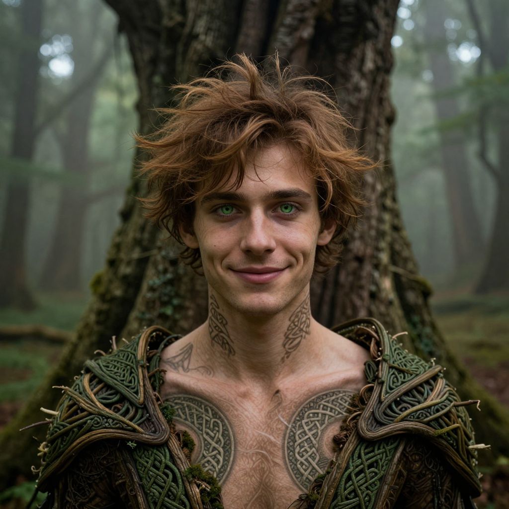 Photograph of a young, white man with tousled, reddish-brown hair and bright green eyes, standing in a misty forest. He has intricate tribal tattoos on his neck and chest. He wears ornate, dark green, fantasy-style armor with Celtic knot patterns. The background features tall, moss-covered trees, creating a mystical, woodland atmosphere with soft, diffused light filtering through the fog. His expression is calm and slightly smiling, enhancing the enchanting, otherworldly vibe of the image.
