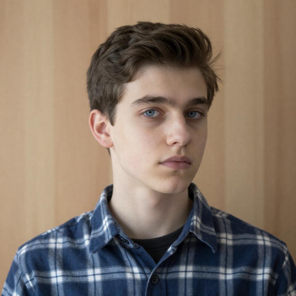 Portrait of a young Caucasian man with short brown hair and fair skin smiling slightly. He is wearing a light beige button-up shirt paired with brown suspenders. The background consists of blurred greenery with sunlight softly illuminating his face, creating a natural outdoor setting.