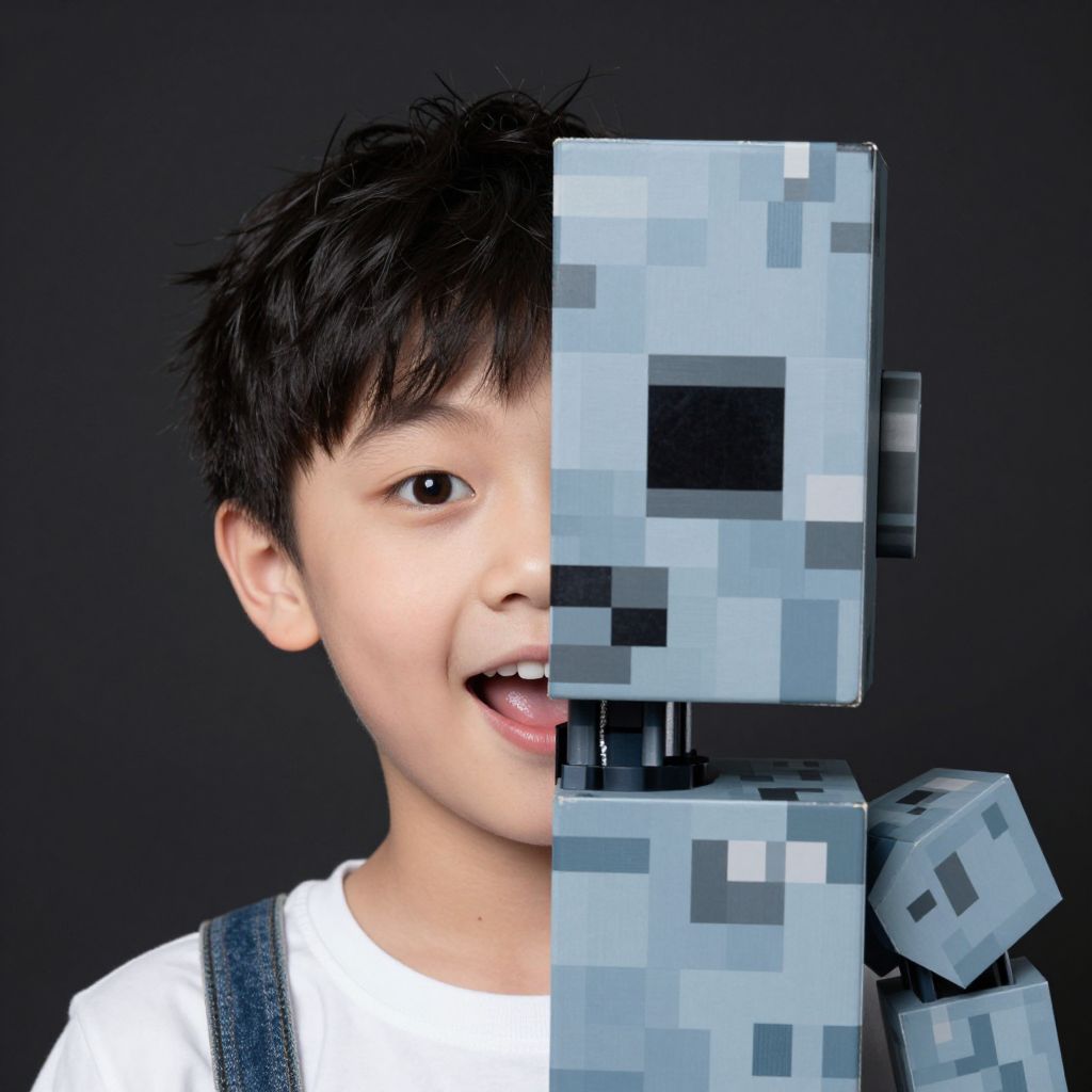 Photograph of an Asian boy with short, dark hair, fair skin, and a cheerful expression, partially obscured by a stack of pixelated Minecraft-style blue cubes. He wears a white shirt with blue denim overalls. The cubes, featuring blocky, pixelated textures, cover the right side of his face and are stacked vertically. The background is solid black, emphasizing the boy and cubes. The image has a playful, digital art feel, blending realistic photography with pixelated elements.
