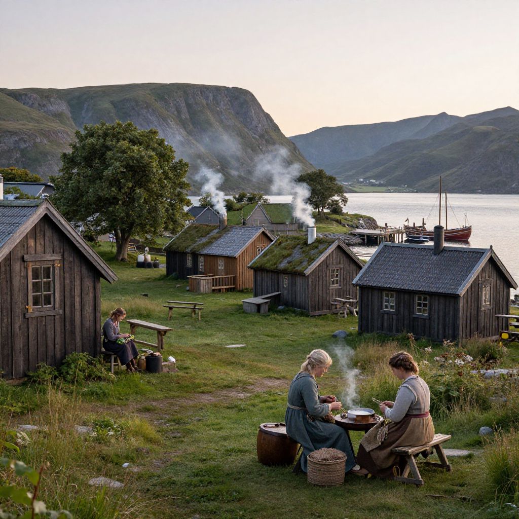 Vikinga village at dawn, wooden longhouses with smoke rising from chimneys, Vikinga women weaving and cooking, lush green surroundings, mountains in the distance, a ship docked by the shore, soft golden light casting warm hues