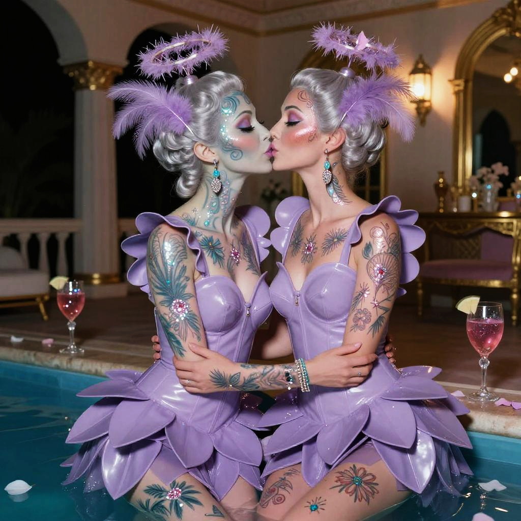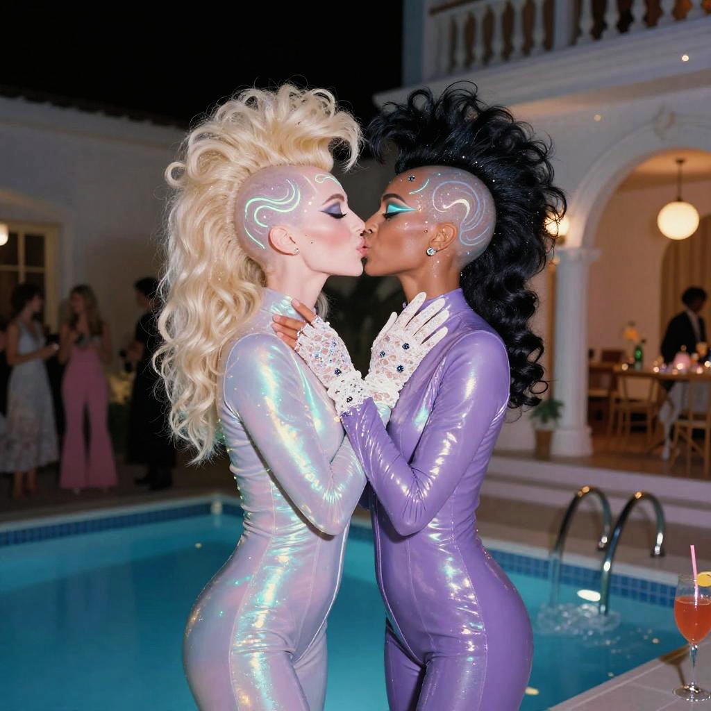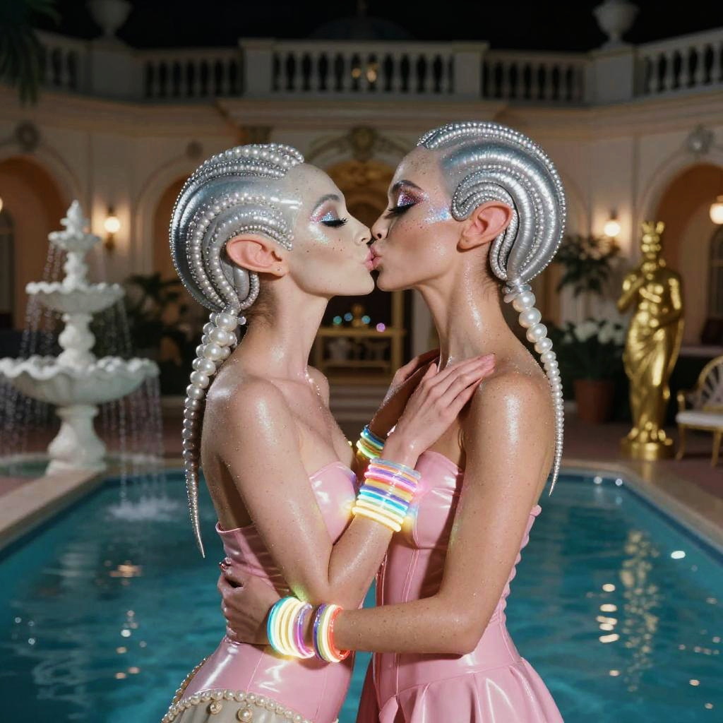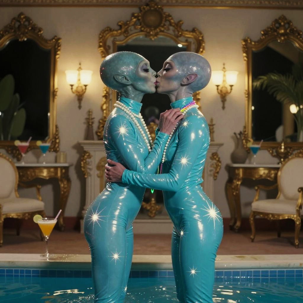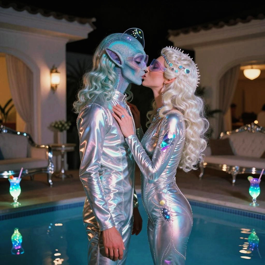 A nighttime pool party in an extravagant 1970s mansion, featuring a stylish alien pair sharing a kiss. They are dressed in glossy emerald green body suits, showcasing their layered holographic bangs and fine glitter mesh amid skin, adorned with neon dotted lip gloss and aurora glow string necklaces. The atmosphere is enhanced by vibrating prism refuse cocktails and lacquered mahogany with gold trim interior, illuminated in soft tones reminiscent of Stanley Kubrick's cinematic style, captured on a Contax T2 with Fujifilm Velvia film, using a 50mm f/1.7 lens.