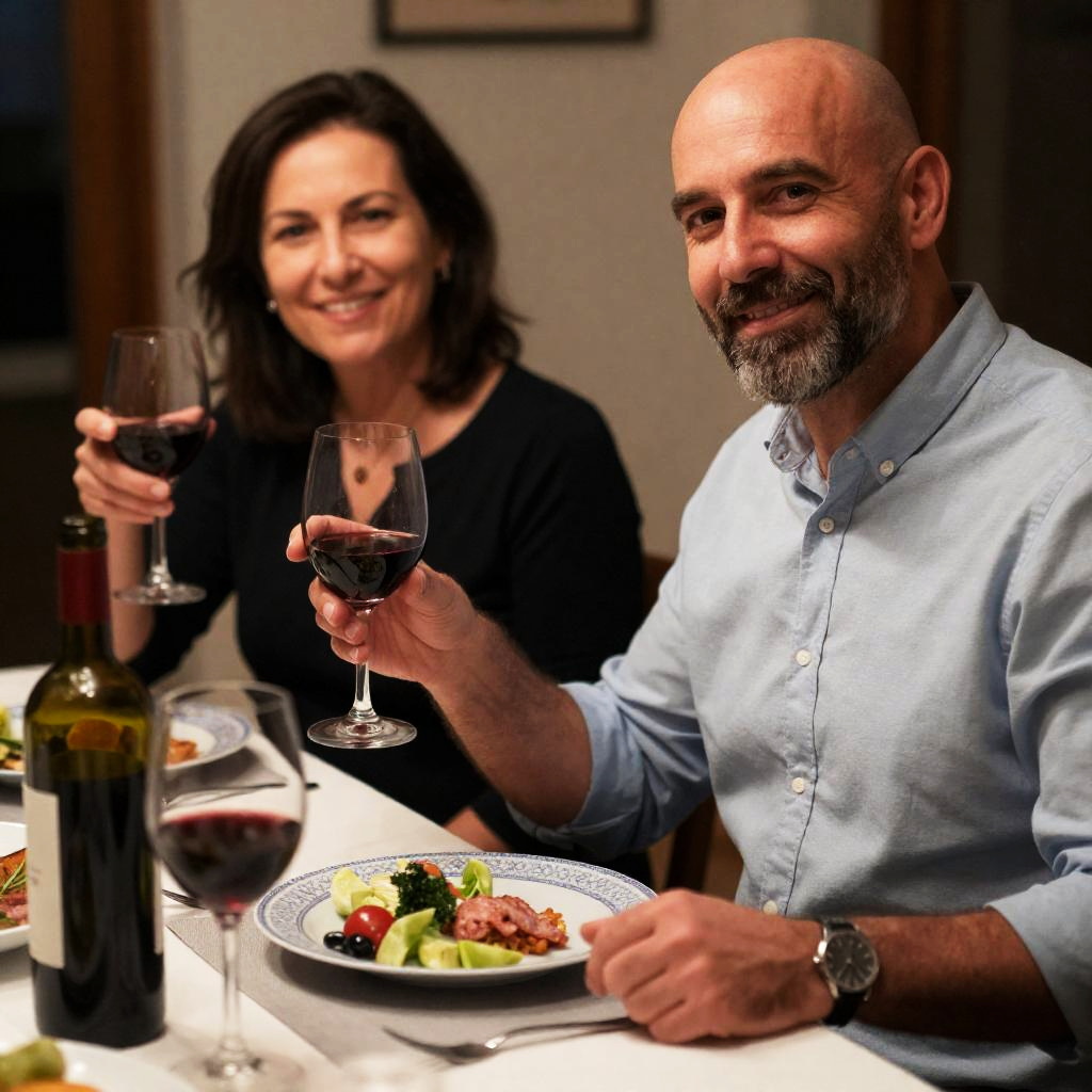 Photograph of a middle-aged couple at a dinner table. The man with a bald head and beard, wearing a light blue shirt, smiles while holding a fork. The woman with dark hair, wearing a black top, smiles and raises a glass. Both have wine glasses and plates with food. Table includes a bottle of wine, salad, and a white plate with blue pattern. Warm indoor lighting.