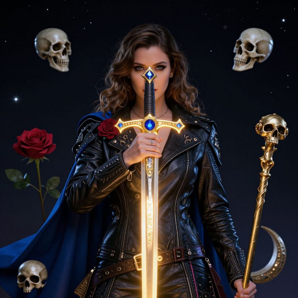 The image depicts a striking scene set against a dark, starry background, evoking a sense of the universe and space. At the center, a woman in a beautifully detailed leather jacket adorned with intricate designs and a large rose, stands confidently. Her face is illuminated by a golden, glowing sword, which she holds in her right hand, casting a warm, radiant light. The sword is encrusted with lapis lazuli gems, adding a touch of elegance and mystique. To her left, a golden cane decorated with a skull adds a contrasting element of darkness and danger. The woman's hair, styled in loose waves, frames her face, and she wears a blue cape that flows behind her, enhancing her regal presence. Surrounding her are various objects, including a large rose, a crescent moon, and a crescent-shaped object, all contributing to the mystical and otherworldly atmosphere. The overall composition is balanced, with the woman and her sword as the focal point, while the surrounding elements create a harmonious yet dynamic scene. The interplay of colors, from the warm glow of the sword to the cool tones of the leather jacket and the deep, starry background, creates a visually captivating and emotionally engaging image.
