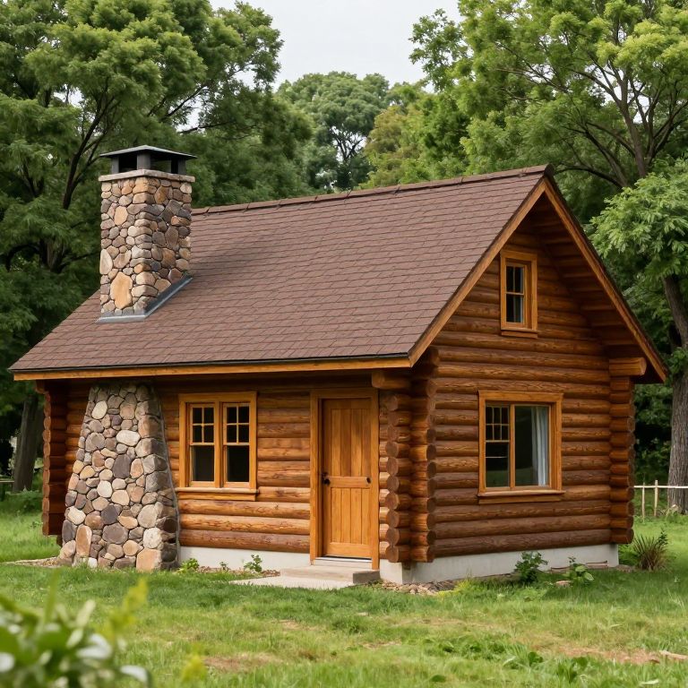 Cordwood construction showcases a charming log cabin with a rustic design, featuring a brown shingled roof, a chimney made of stacked stones, three windows with wooden frames, and a central wooden door, all surrounded by lush green trees and a grassy lawn.