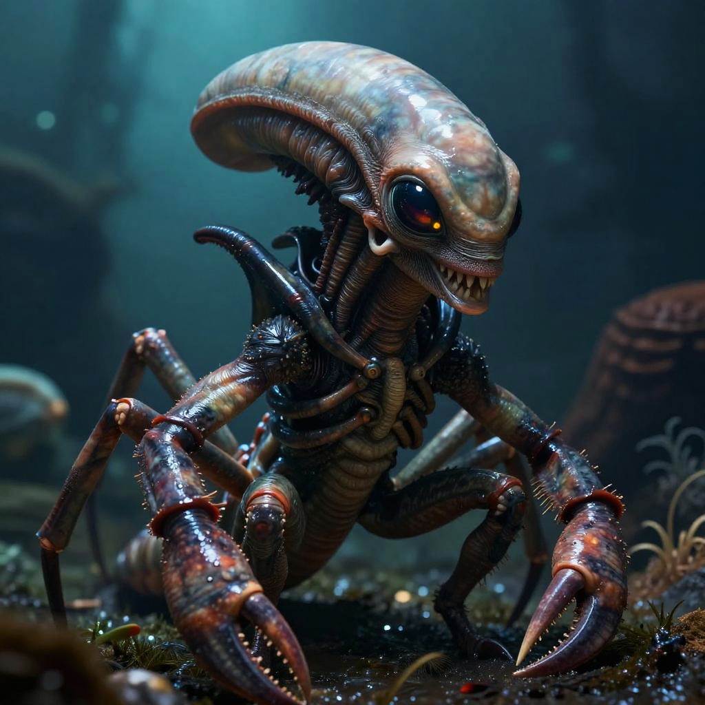 A photorealistic illustration of an alien crustacean with lifelike textures, moist skin, and detailed pincers. The creature features glowing eyes and is set against a dark oceanic background with mysterious lighting, enhancing the intense color contrast and depth of field.