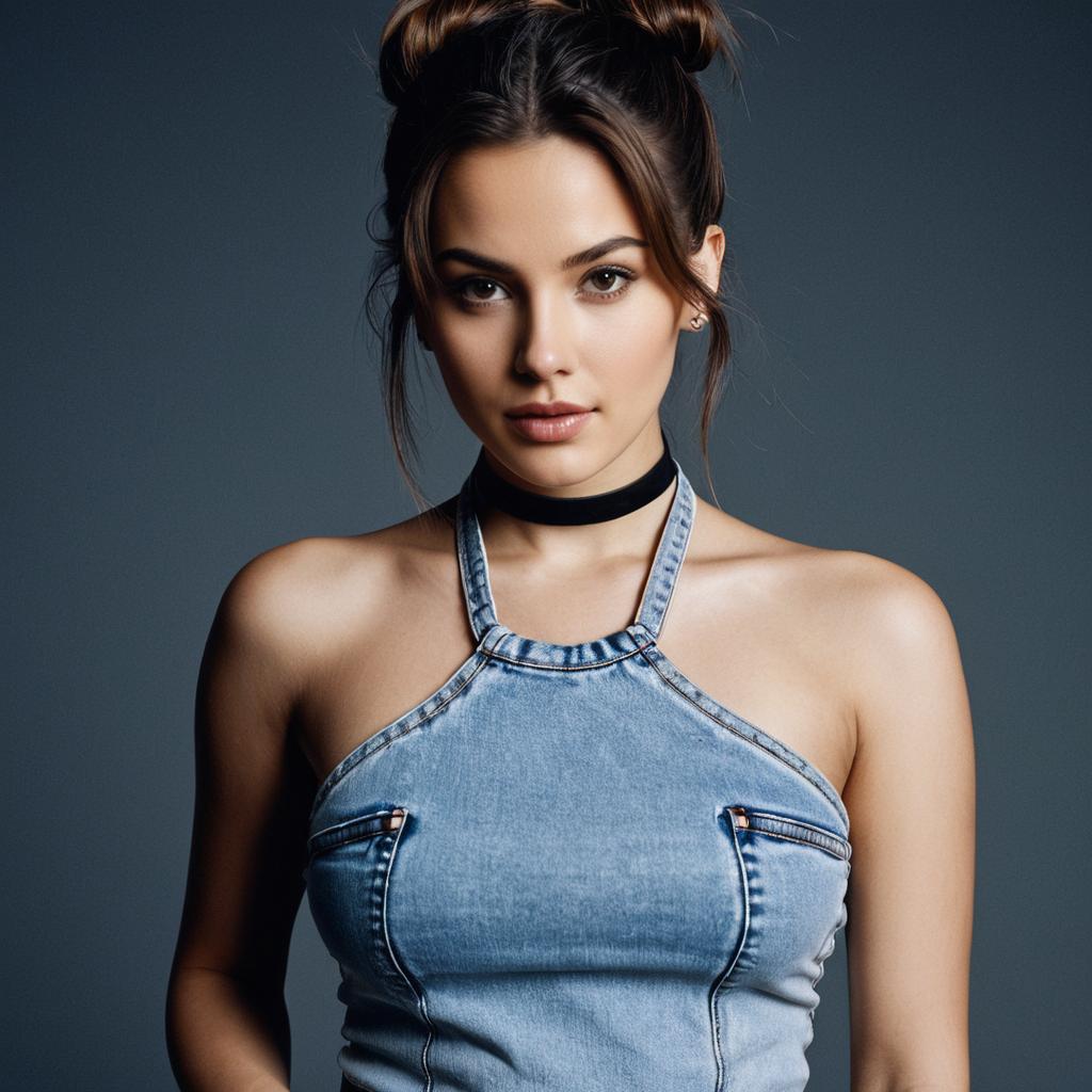 Photorealistic image of a young woman with long brown hair and brown eyes wearing a white cropped tank top and multicolored flowy dance shorts with geometric patterns. She is standing against a plain dark background looking directly at the viewer, showcasing casual athletic fashion.