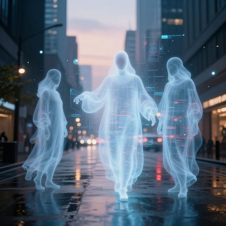 Ghostmix - an imaginative scene where translucent spirits merge with holographic projections in a futuristic metropolis, featuring reflective wet streets, soft glowing orbs, and a blend of spectral and digital art styles under twilight.