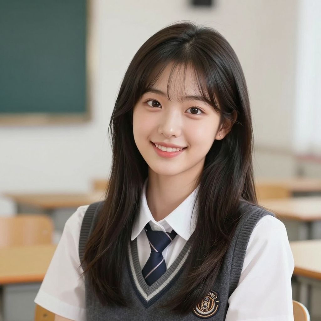 Photograph of an Asian teenage girl with fair skin and long, straight black hair, smiling gently at the camera. She is wearing a white dress shirt, dark navy-blue tie with a diagonal stripe pattern, and a black V-neck sweater vest featuring a small school emblem on the left side. The background is a blurred classroom with green chalkboards and wooden desks. The lighting is bright, emphasizing her clear, smooth complexion and natural makeup. Her expression is friendly and approachable. The overall composition highlights her as the central subject with a shallow depth of field.