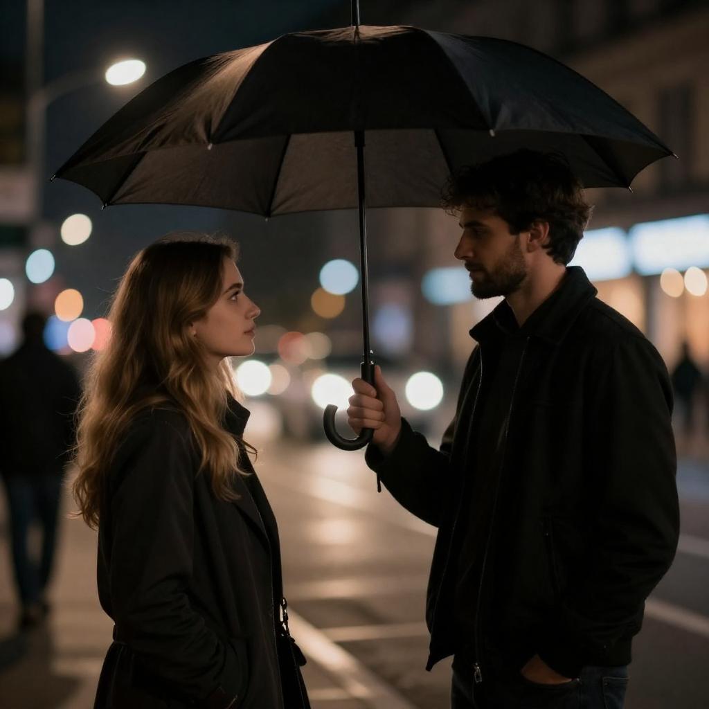 Black-and-white photograph of a man and woman standing in a busy train station. The man, in a long dark coat and patterned pants, faces the woman in a knee-length dark dress. Background includes blurred signs, pillars, and other passengers. The man has short hair, and the woman has shoulder-length hair.
