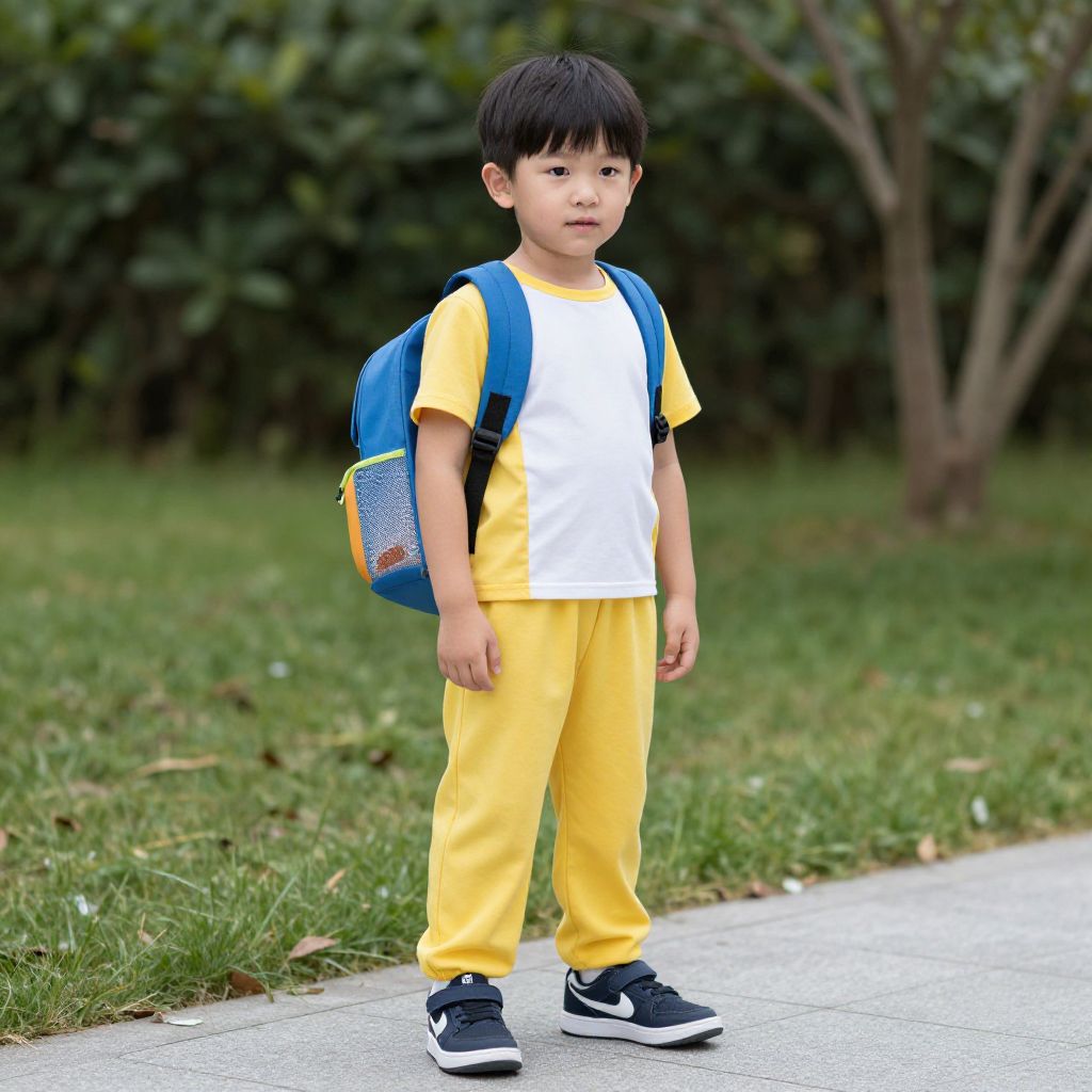 "Vissago Kid Costume, young boy with a backpack standing outside"