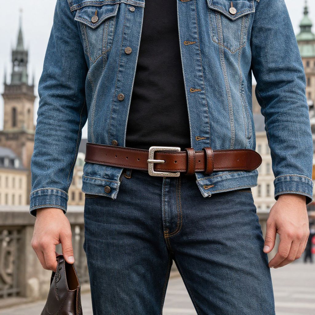 Statement belts for men, european man, a rugged european man in his 30s, showcasing a high-quality statement belt made of premium leather, paired with a denim jacket and boots, standing against a backdrop of a historic european cityscape