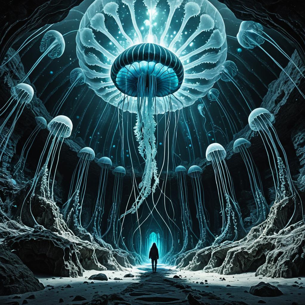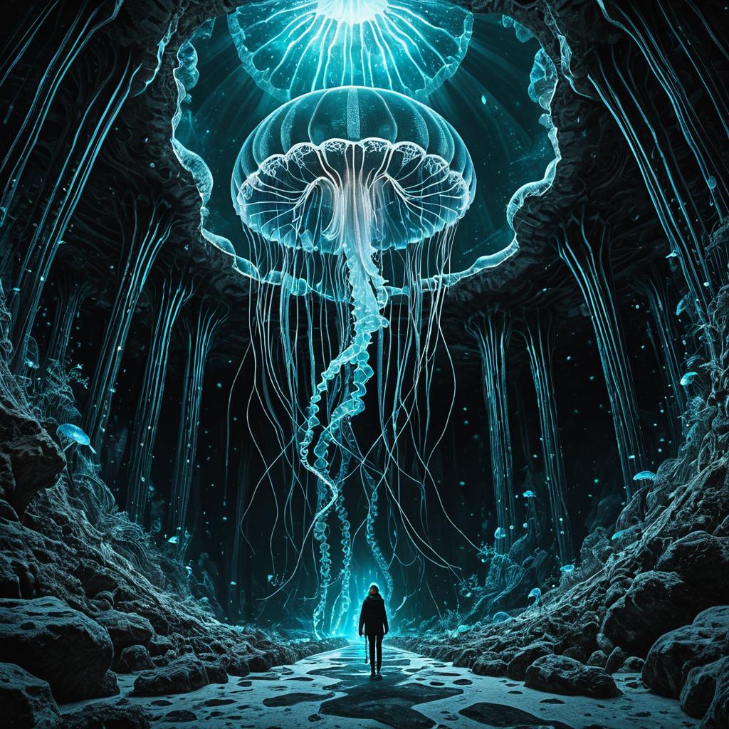 Ethereal Jellyfish in Bioluminescent Crystal Cavern