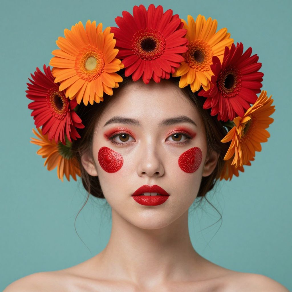 Radiant woman adorned with a vibrant floral crown of red and orange gerbera daisies, complemented by circular red face decorations featuring intricate designs, set against a serene teal background.