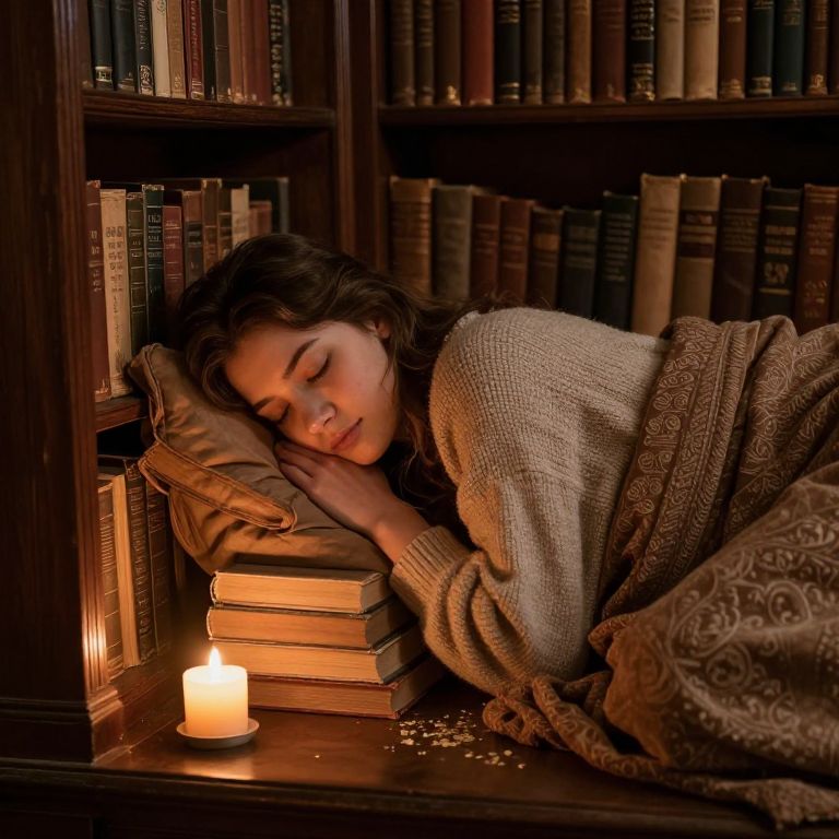 Dormidas curled up in a cozy library nook surrounded by ancient books and warm candlelight, peaceful and inviting atmosphere, soft shadows and intricate textures on wood and fabric, warm earth tones and inviting mood.