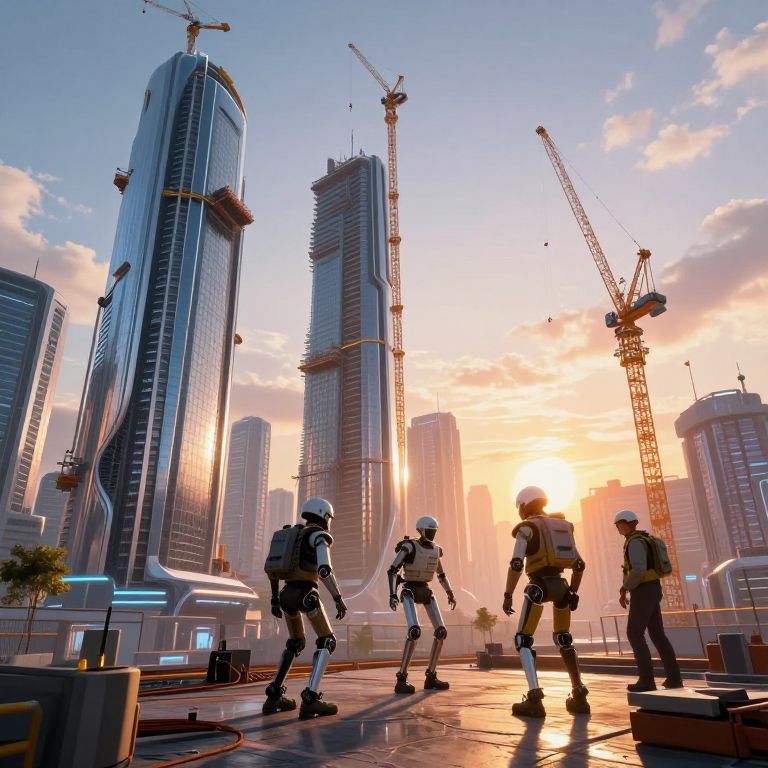 Constructys: a futuristic construction site with towering cranes assembling sleek, modern skyscrapers, workers in advanced exoskeleton suits coordinating seamlessly under a vibrant sunrise, cyberpunk city skyline in the background, highly detailed and dynamic lighting.