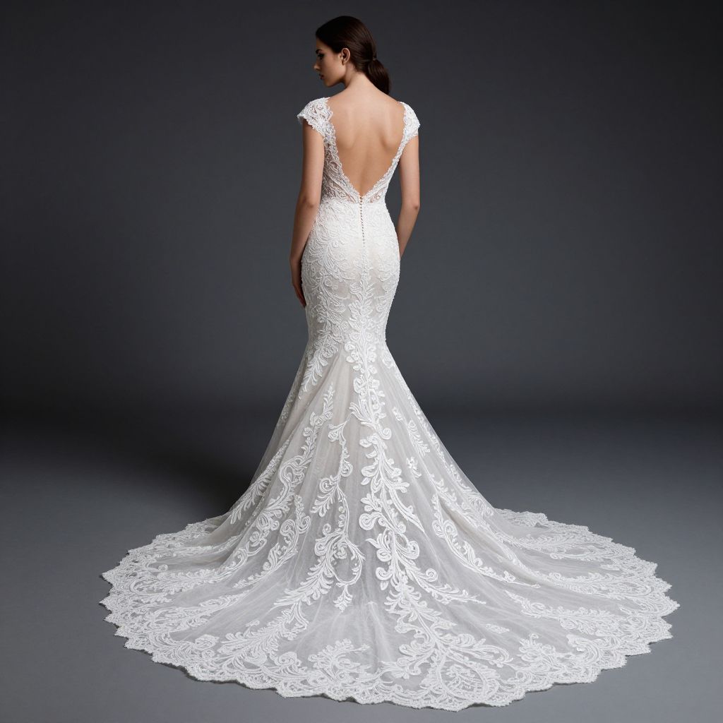 Elegant bride showcasing a low-back fairytale wedding dress with intricate lace detailing and a flowing satin skirt, captured from behind against a neutral backdrop.