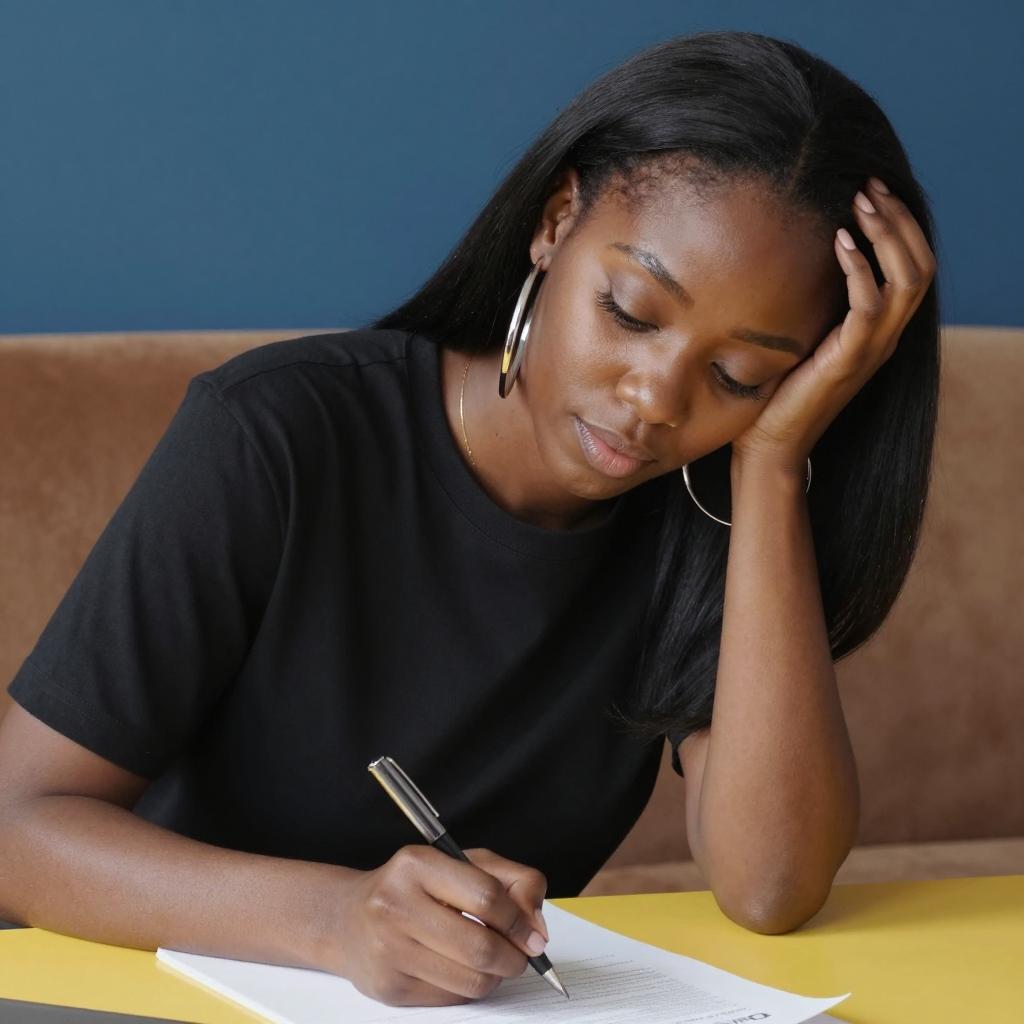 Black-and-white photograph of a narrow stairwell. A man in a dark suit sits at the bottom right, facing the stairs. A woman with curly hair sits on the middle step, leaning against the wall. Two open doors frame the stairwell.