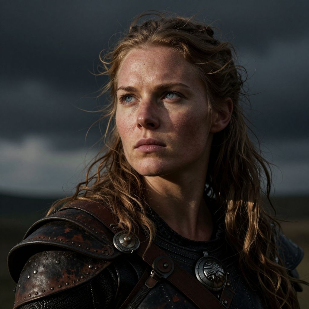 A high-definition digital illustration of a Viking woman adorned in ornate armor and a green cloak, featuring intricate details and dramatic lighting that evoke a cinematic fantasy style reminiscent of Norse mythology.