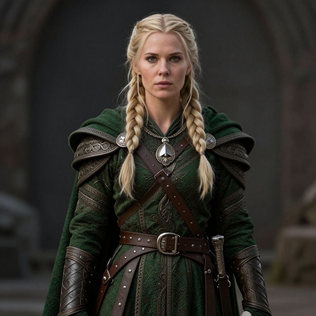 Photograph of a blonde woman with fair skin and braided hair, standing in a dimly lit medieval-style setting. She wears a dark green, intricately patterned tunic with brown leather armor plates on the shoulders and forearms, a brown leather belt with a silver buckle, and a silver pendant at the neckline. Her expression is serious, and she gazes directly at the camera. The background is blurred, featuring dark, arched structures, adding to the medieval ambiance. The lighting highlights her facial features and the texture of her clothing.