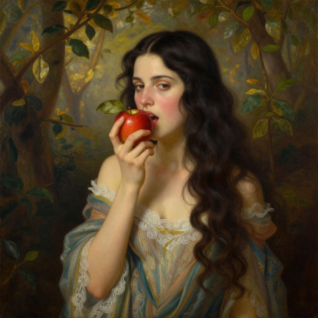 In this captivating oil painting, a woman with long, dark, wavy hair is depicted holding a vibrant red apple with a green stem and leaves, reminiscent of the biblical story of Adam and Eve. She is dressed in an elegant, lace-trimmed gown that contrasts beautifully with the lush, natural surroundings. The background features a serene forest scene with trees and foliage, bathed in soft, warm light that filters through the leaves, creating a sense of depth and tranquility. The woman's expression is one of contemplation, as if she is about to take a bite of the apple, symbolizing the moment of choice and temptation. The overall composition, with the woman positioned centrally and the apple held close to her face, draws the viewer's attention to the central theme of the painting. The interplay of colors, textures, and shapes creates a harmonious balance, evoking a sense of nostalgia and timeless beauty.