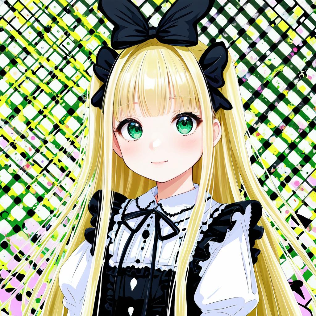 Mononobe alice, nijisanji, 1girl, green eyes, blonde hair, very long hair, long hair, hair ribbon, hair bow, black ribbon, black bow, virtual youtuber, virtual youtuber, by artist nam (valckiry), anime