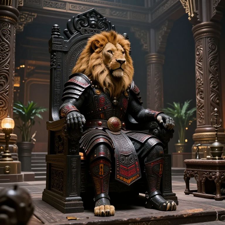 Digital artwork of a regal lion in ornate black armor, seated on a grand, intricately carved throne in a dimly lit, ancient temple