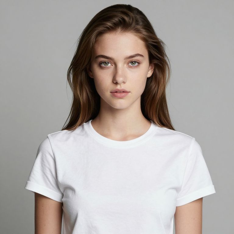 Photograph of a young woman with fair skin and green eyes, looking directly at the camera with a neutral expression. She has long, straight brown hair that falls past her shoulders. She is wearing a plain, white, short-sleeved t-shirt. The background is a solid, light gray color, creating a minimalist and focused composition. The lighting is even, highlighting her natural features without casting shadows. The overall style is clean and modern, emphasizing simplicity and natural beauty.