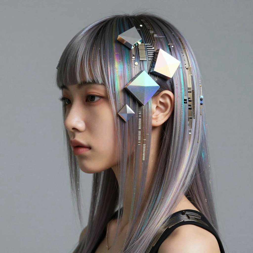 AI generated haircut, avant-garde hair design with geometrical shapes and holographic effects, shimmering strands reflecting soft ambient light, tech-inspired fashion model, intricate patterns resembling microchips, modern studio lighting, ultra-detailed