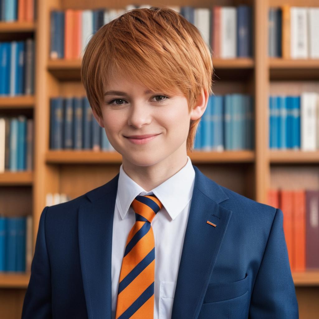 Portrait of a teenage boy with red hair wearing a white dress shirt and blue striped tie, smiling while sitting in front of wooden bookshelves filled with books. The setting appears to be a school or home library.