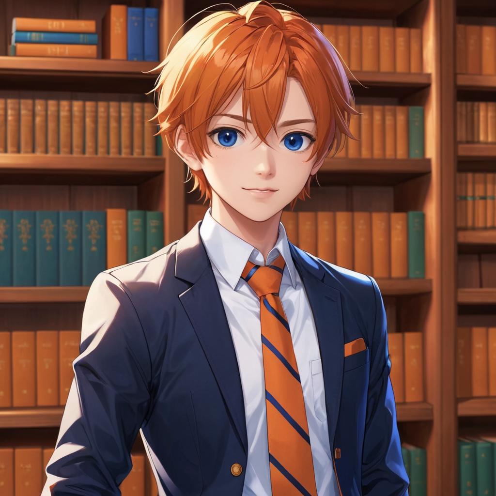 1boy, male focus, necktie, solo, bookshelf, shirt, jacket, white shirt, suit, looking at viewer, upper body, formal, indoors, orange hair, collared shirt, library, blue eyes, long sleeves, brown hair, closed mouth, blue jacket, blue necktie, smile, short hair, pocket