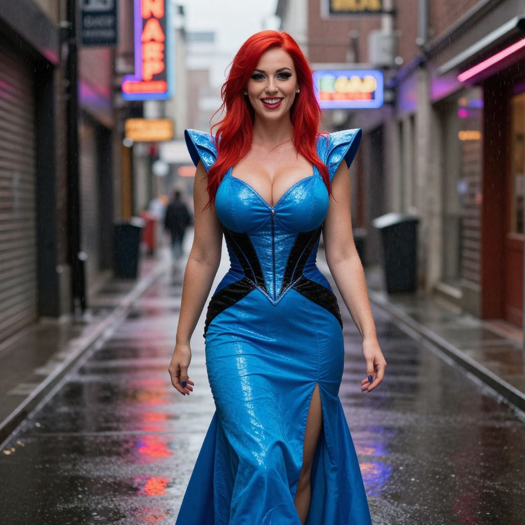 A bold and vibrant woman with bold red hair, high cheekbones, and a bright smile stands in a rain-drenched city alley, dressed in a vivid electric blue and black fashion costume gown with asymmetrical cuts and metallic fabric, caught in the glow of neon signs reflecting off wet pavement.. The woman has big tits and cute face