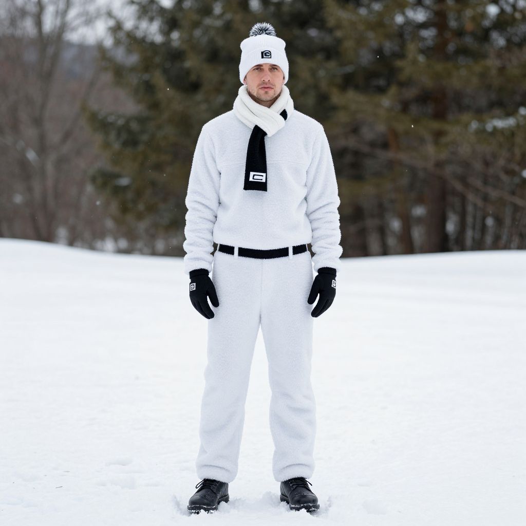 A photograph of a man standing in a snowy landscape. He wears an all-white outfit including a long-sleeved shirt, pants, gloves, and a hat with a black logo. He has black gloves and shoes. His expression is neutral. The background shows a blurred, snow-covered field with dark green pine trees. The snow is bright white, contrasting with his outfit. The man is centrally positioned, and the image has a high contrast and sharp focus on the subject.