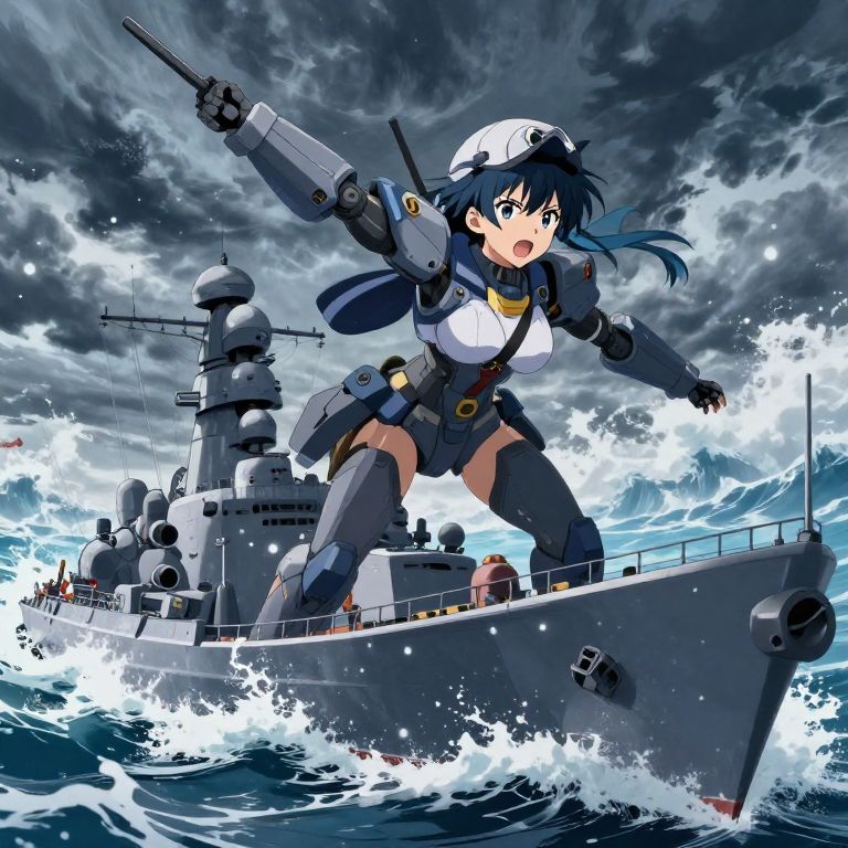 Anime-style digital illustration of a blue-haired, armored, anime girl with a white cap, wielding a gun, on a stormy ship in turbulent waters
