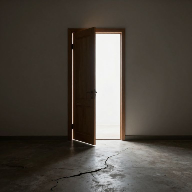 Photograph of a dimly lit, empty room with a cracked concrete floor and gray, smooth walls. A wooden door, slightly ajar, is centered in the image, emitting a bright, white light that starkly contrasts with the surrounding darkness. The door's edge is illuminated, highlighting its simple, rectangular design with a visible hinge on the left side. The bright light creates a strong, dramatic effect, casting minimal shadows on the floor. The overall atmosphere is mysterious and slightly eerie, emphasizing the stark contrast between light and shadow.