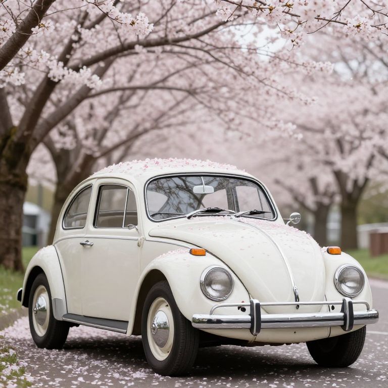 An old Volkswagen Beetle covered in cherry blossom petals and flowers, set against a backdrop of a cherry blossom tree in full bloom.