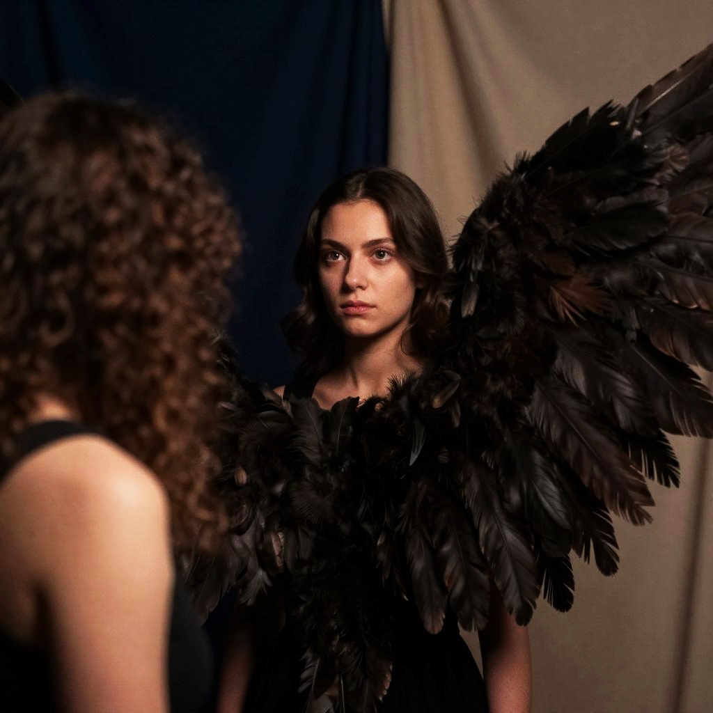 Photograph of a scene with two people. One person with curly brown hair, partially visible from the side, looks at another person with large, dark feathered wings, facing them. Background includes draped blue and beige fabric. Wings dominate the right side, overlapping the second person's upper body. Intense gaze from the person with curly hair. Dark, shadowy background.