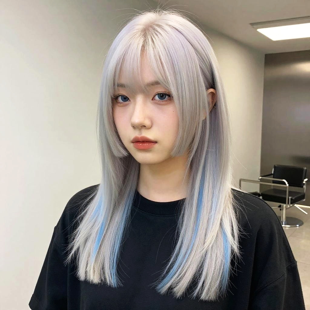 Change hair color in photo to pastel lavender with hints of silver, soft matte finish, style in a sleek straight bob, ambient natural light, close-up portrait showcasing smooth texture and subtle color gradients, hyperrealistic rendering.