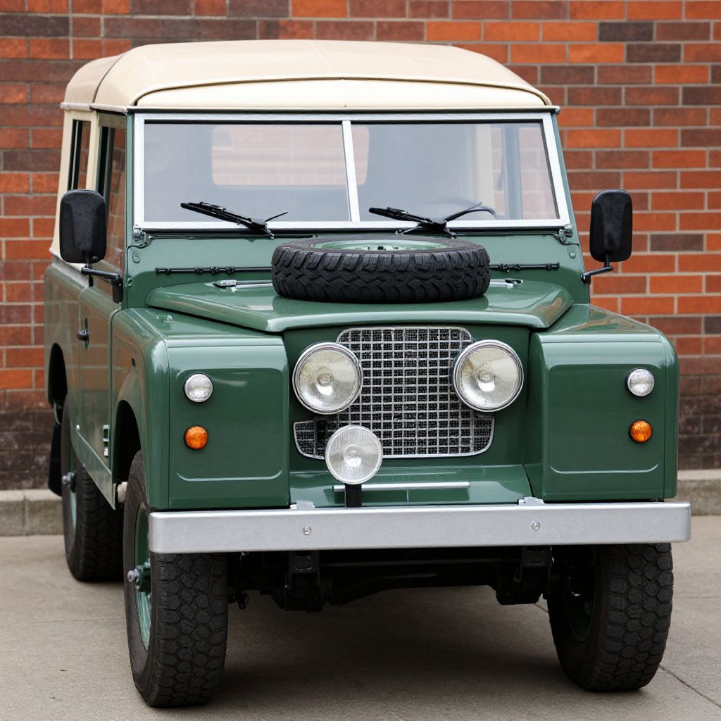 Classic green Land Rover Series III parked gracefully in front of a brick wall, featuring a cream-colored roof, spare tire mounted above the hood, and distinctive round headlights, exuding vintage charm and rugged elegance.