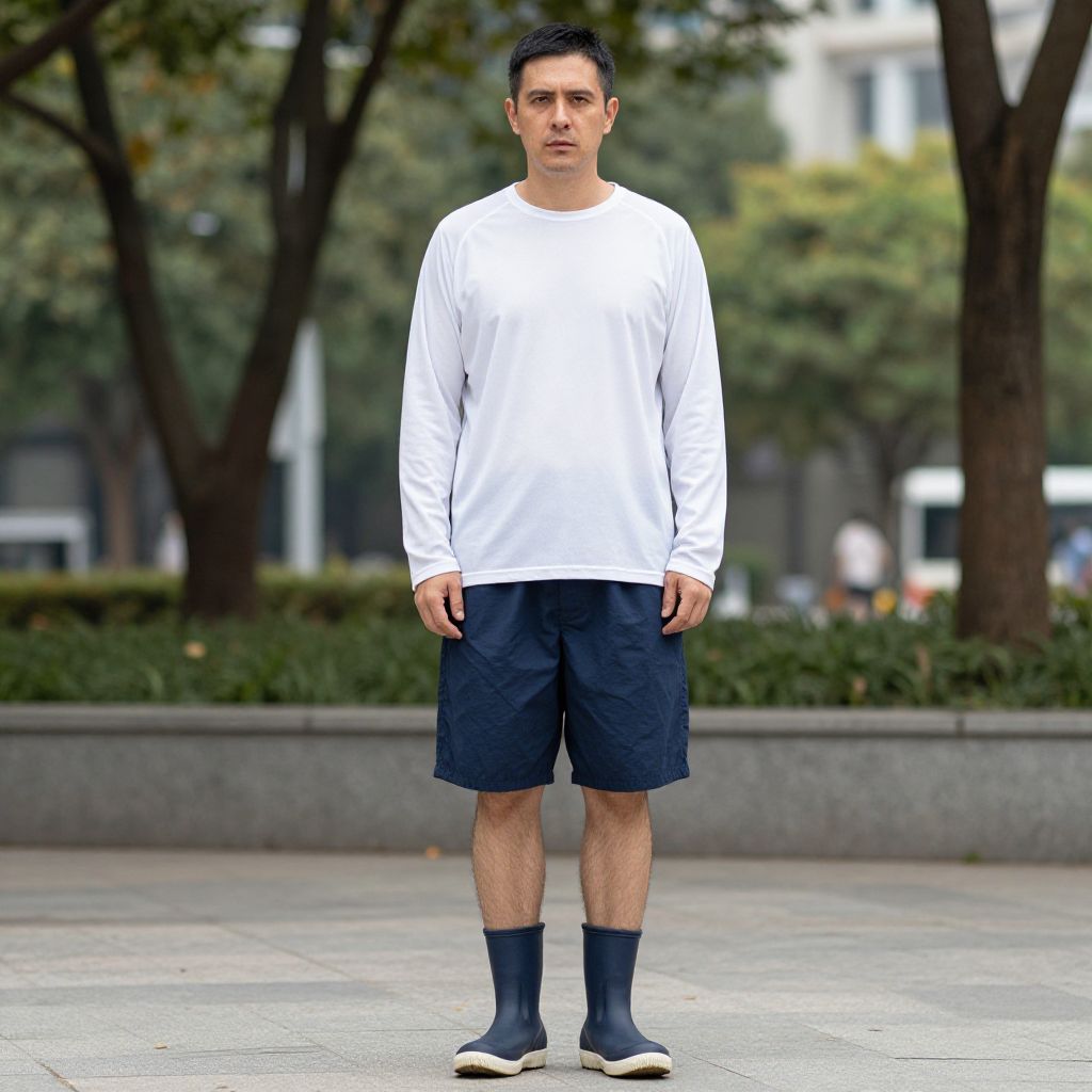 A man, long-sleeve UV-protective shirt, loose-fit navy shorts, durable rubber-soled shoes, crisp white and navy combo, breathable mesh fabric, urban park, hand-tinted photograph, relaxed expression, enjoying the sunny day. Man has masculine face and piercing eyes