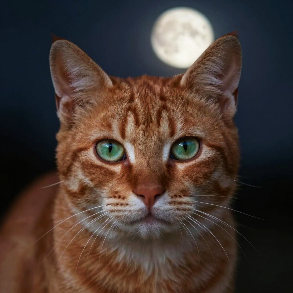 Close-up portrait of a rote Katze with piercing green eyes, vivid crimson fur shining under moonlight, mysterious and elegant ambiance, high detail on fur and whiskers