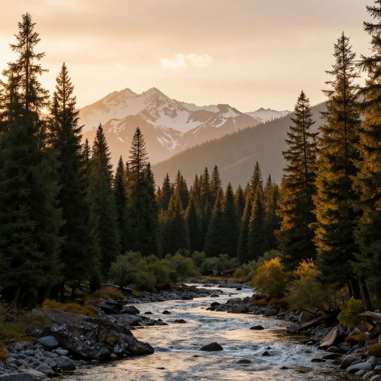 Sunset bathes a serene mountainous landscape in golden hues, where towering evergreen trees frame a tranquil river winding through rocky banks, leading the eye toward distant snow-capped peaks shrouded in mist.