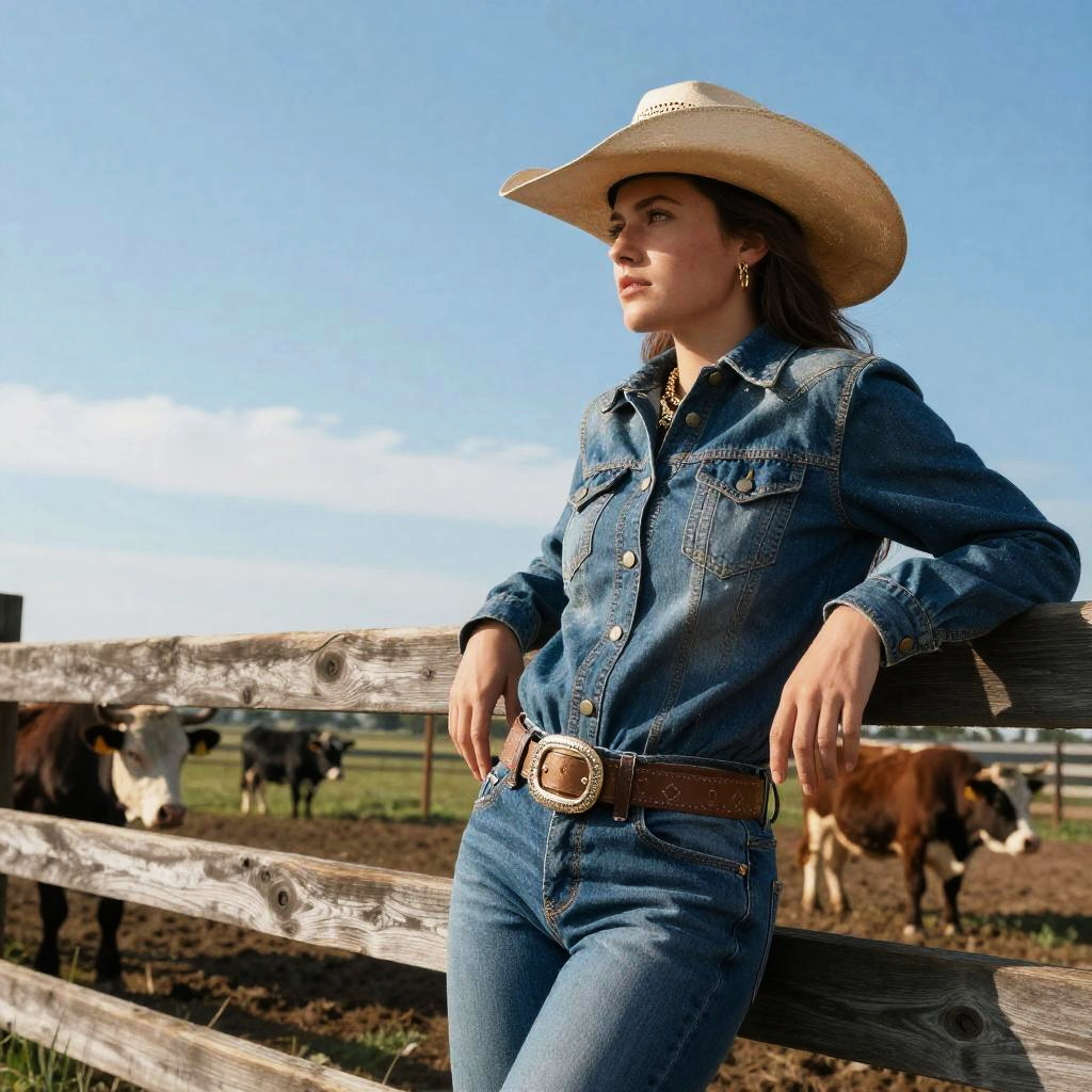 Petite cowgirl leaning against a wooden fence on a ranch, surrounded by cattle, bright blue sky, detailed clothing textures, soft natural lighting, realistic style