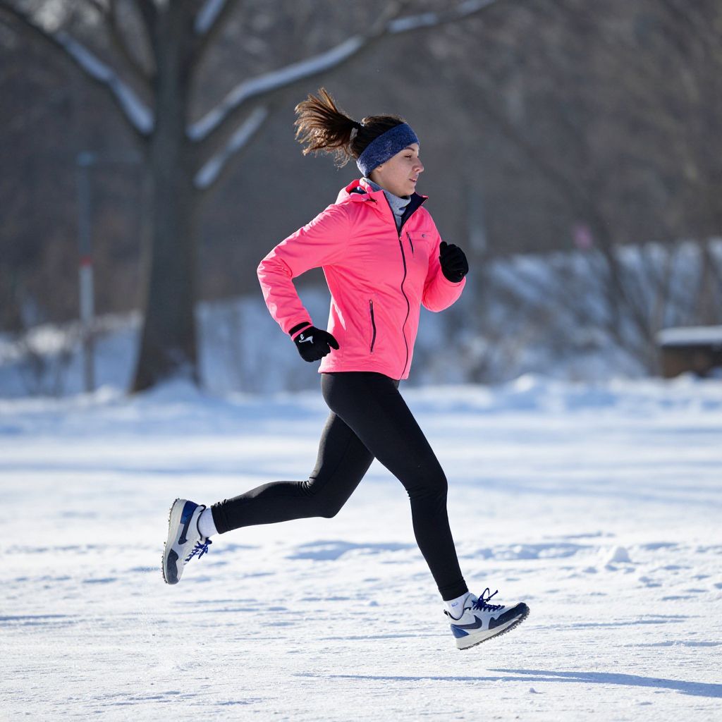 Photograph of a woman jogging in bright pink jacket, black pants, and white sneakers on a snowy, tree-lined path.