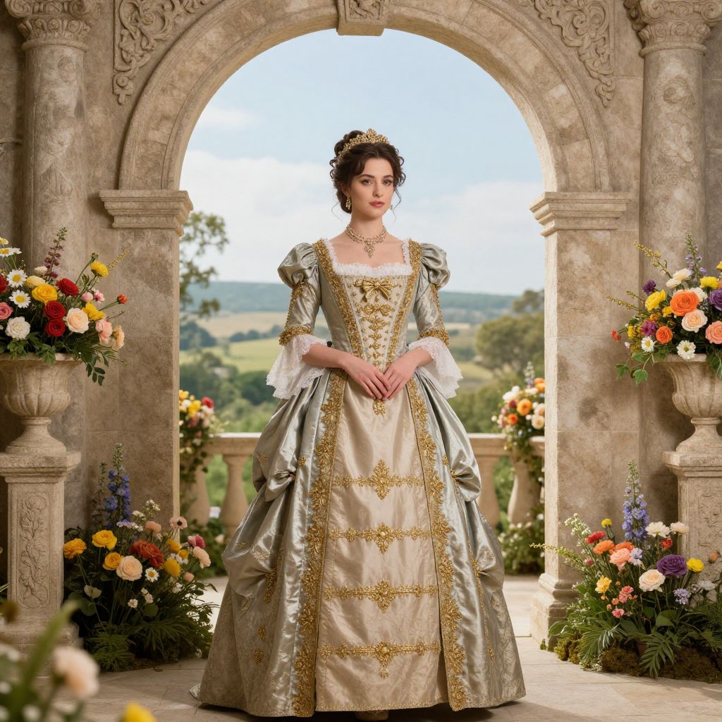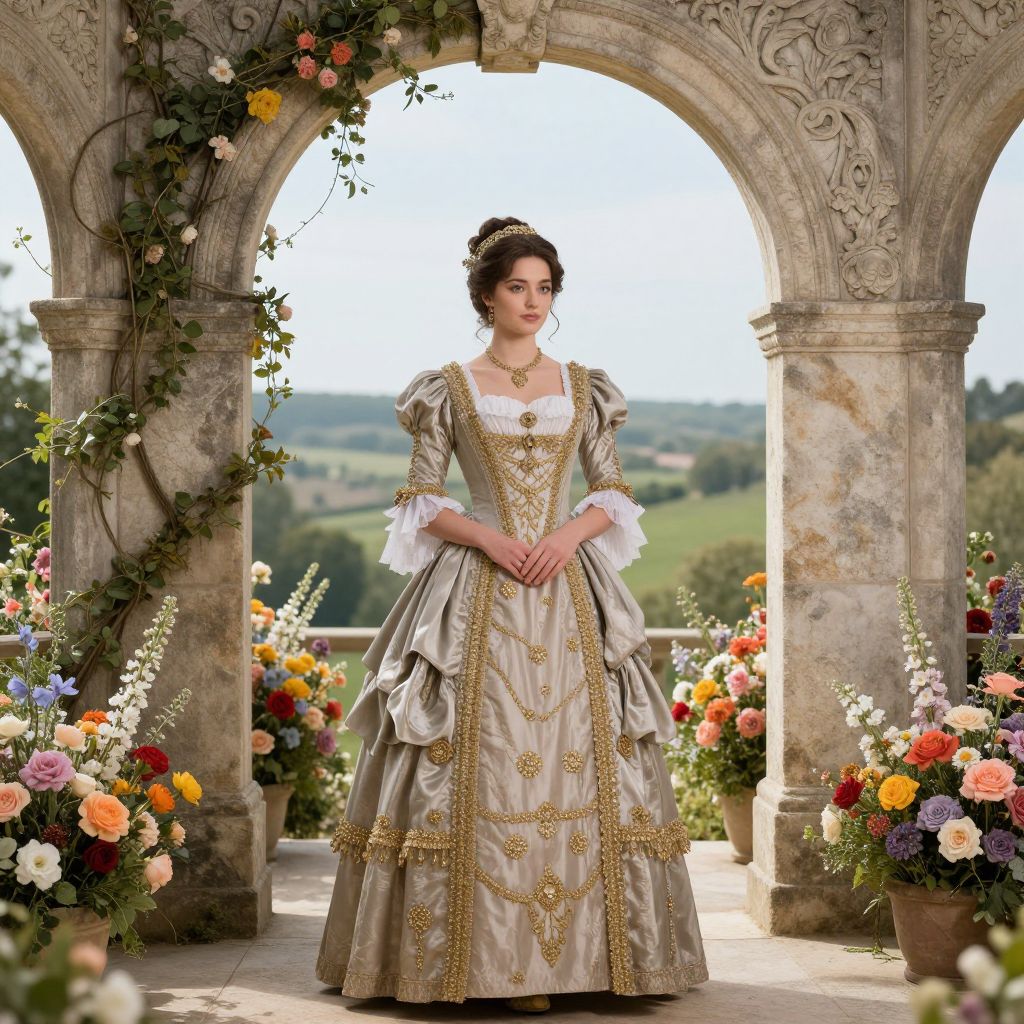 Elegant portrait of a woman in a Victorian-style gown adorned with gold embellishments, standing gracefully beneath an ornate stone archway framed by vibrant floral arrangements and a serene landscape beyond.