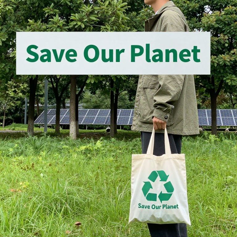 An environmentally conscious person wearing a reusable shopping bag and a recycled material jacket, standing in a lush green park with a large sign that reads 'Save Our Planet,' surrounded by a group of trees and solar panels in the background, capturing the essence of sustainability.