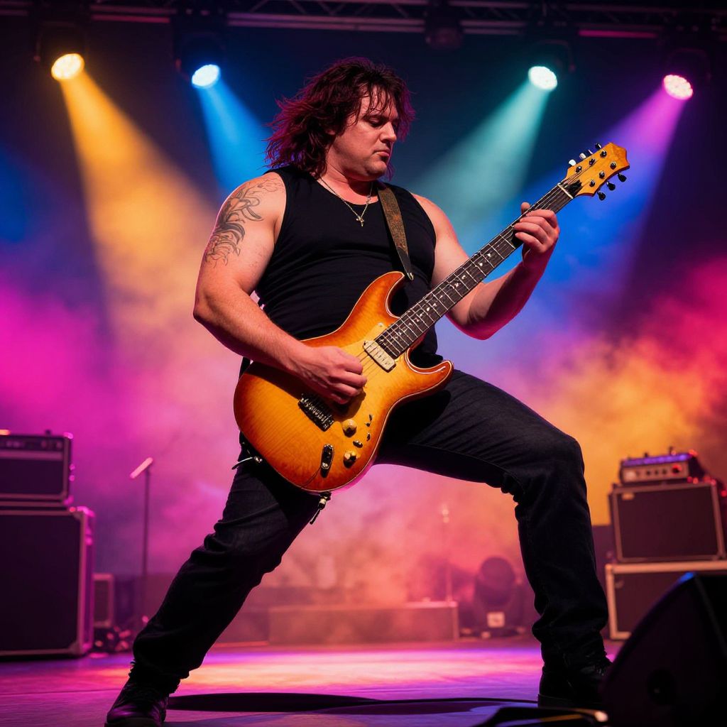 Tall broad shouldered man playing electric guitar on stage under colorful spotlights, rock concert atmosphere, dynamic pose, energetic and vivid illustration