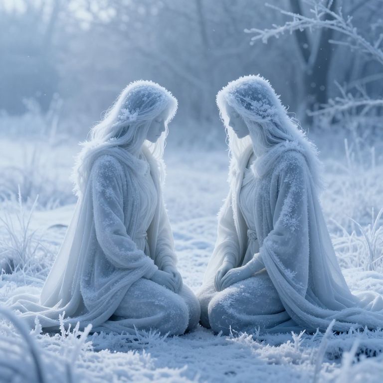 Two ethereal figures, cloaked in frosty light, kneel in a field of crystalline snow, their forms merging seamlessly with the icy landscape as if sculpted from the very memory of winter's breath.
