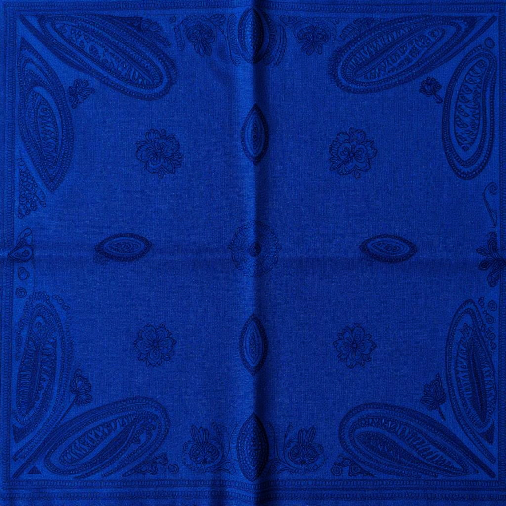 Royal blue blue bandana background featuring intricate paisley patterns, delicate floral motifs, and subtle geometric shapes, all woven into a smooth fabric texture with a rich, deep blue hue under soft, ambient lighting for a vibrant and elegant look.